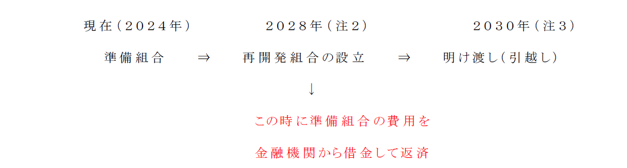 (注2)(注3)令和6年10月開催予定の再開発説明会(当地域内の某マンションの区分所有者を対象とする準備組合主催のもの)の資料の記載によります。明け渡しの後に、既存の建物を取り壊して、新たな建物などを造ります。