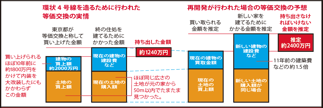 私達は、11年前に、環状4号線予定地にある一戸建ての家を立ち退き、元の家の近所である現在の一戸建ての家に移り住んでいます。その際、行政からは、等価交換でお願いしますとのことでしたので、安心していました(初めてのことで等価交換の本当の意味が分からず)が、実際には、持ち出し(自己負担)をしなくては、元の家と同じスペース(居住面積)を確保することができませんでした。(下記の図を参照してください。)