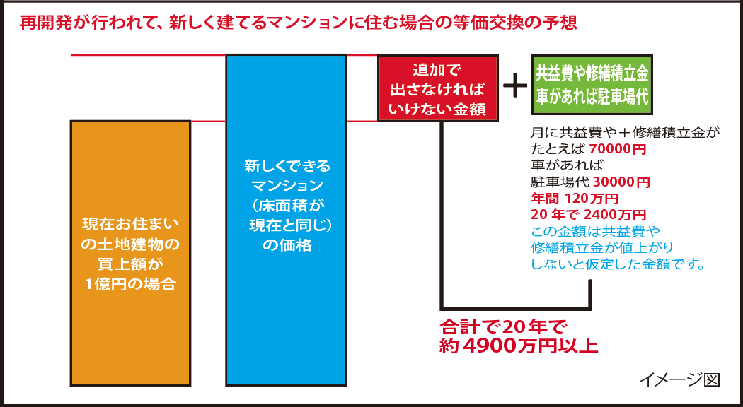 再開発をしたら少し狭くなっても新しいマンションに住めるならいいと思っている方が多いと思いますが、おそらく、等価交換の金額では新しいマンションの部屋の金額に合わないので、追加で多額のお金を出さないと、入れてもらえないのではないでしょうか?狭くなって、追加で多額のお金を支払い、管理費や修繕積立金も値上がりするとなれば、悪夢です。
